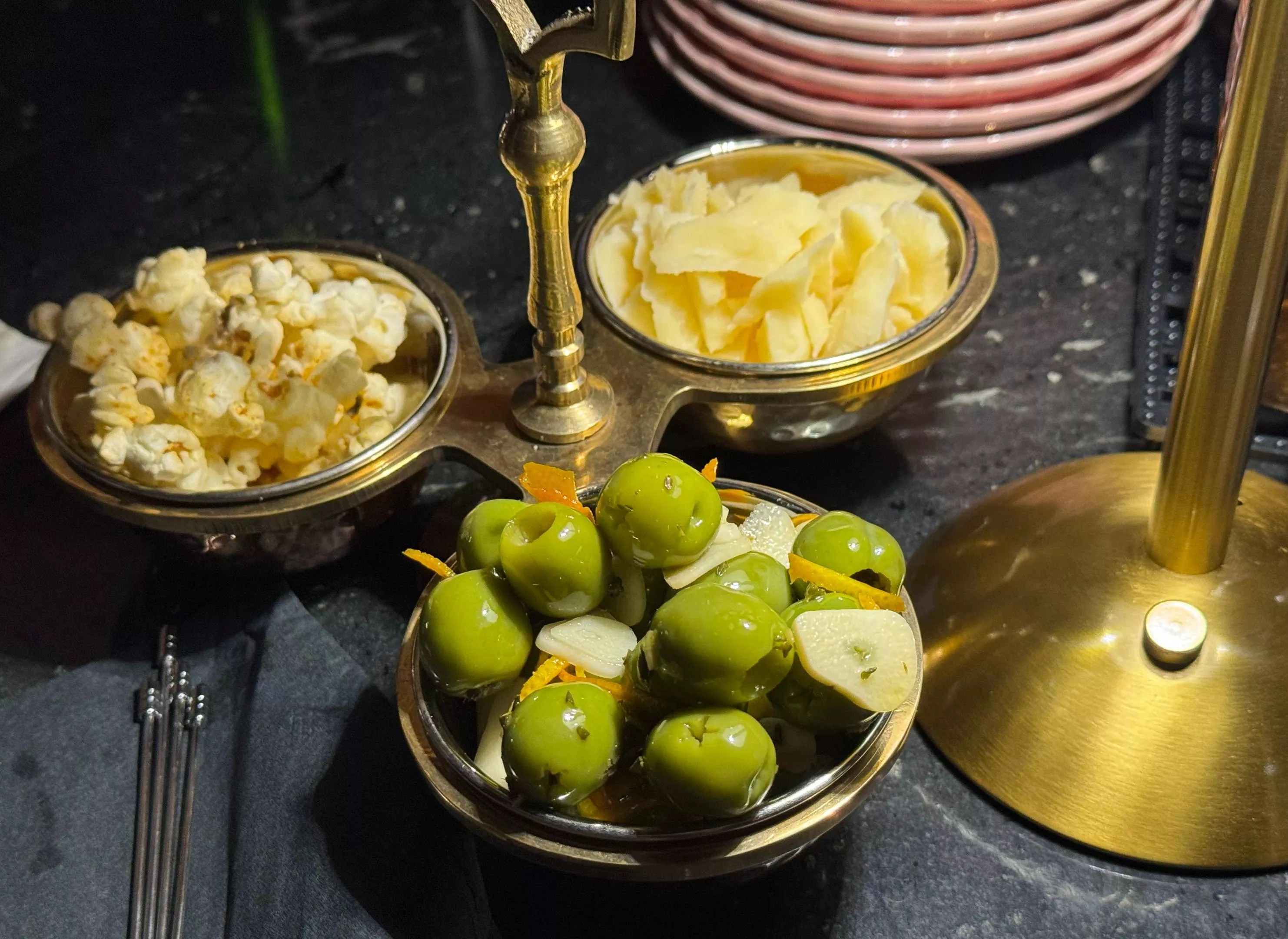 Perhaps the most notable addition to the menu is the snacks, a welcome addition to the timed 90-minute imbibing session. Drinks come with an edible garnish, and there’s a snack trio available that includes parmesan cheese, togarashi-dusted popcorn and warm olives marinated with garlic and orange peel.