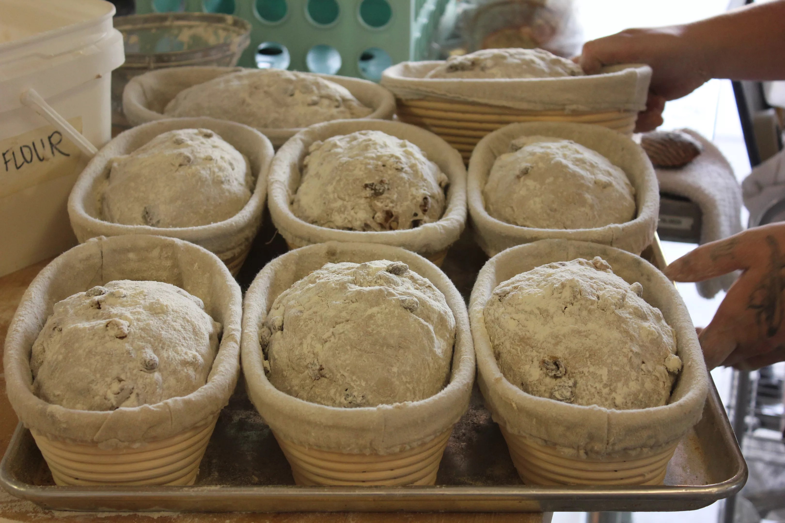 Przybyl was busy moving from refrigerator to dough to oven, all while overseeing the workings of two other bakers. One was bagging sliced loaves. Another was baking vegan burger buns, putting ciabatta on cooling racks, and shaping a duffel-bag-size mass of dough into raisin-walnut loaf portions. The portions would proof in baskets before baking.