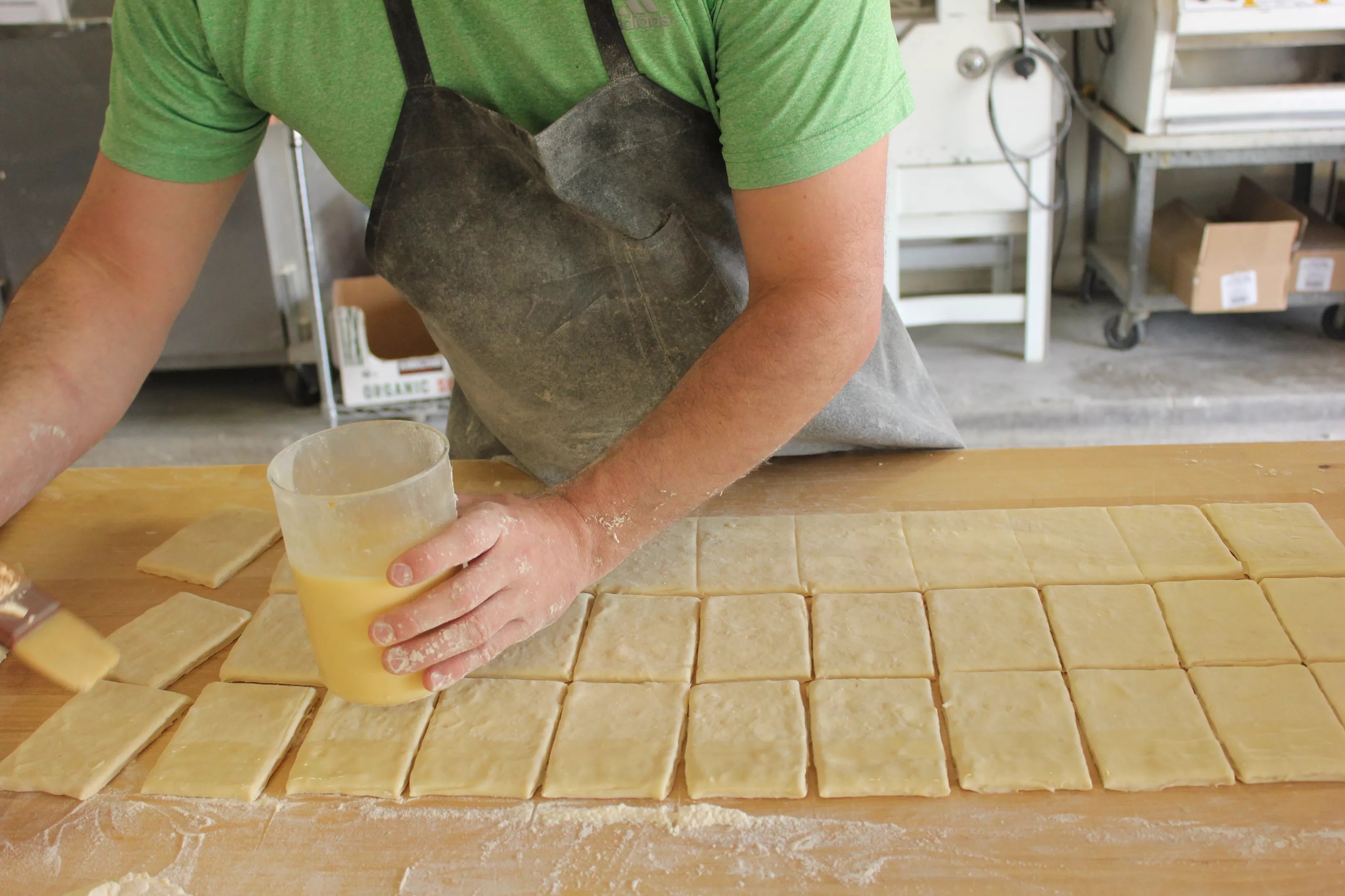 After rolling and lamination, brushing an egg wash onto pieces of croissant dough.
