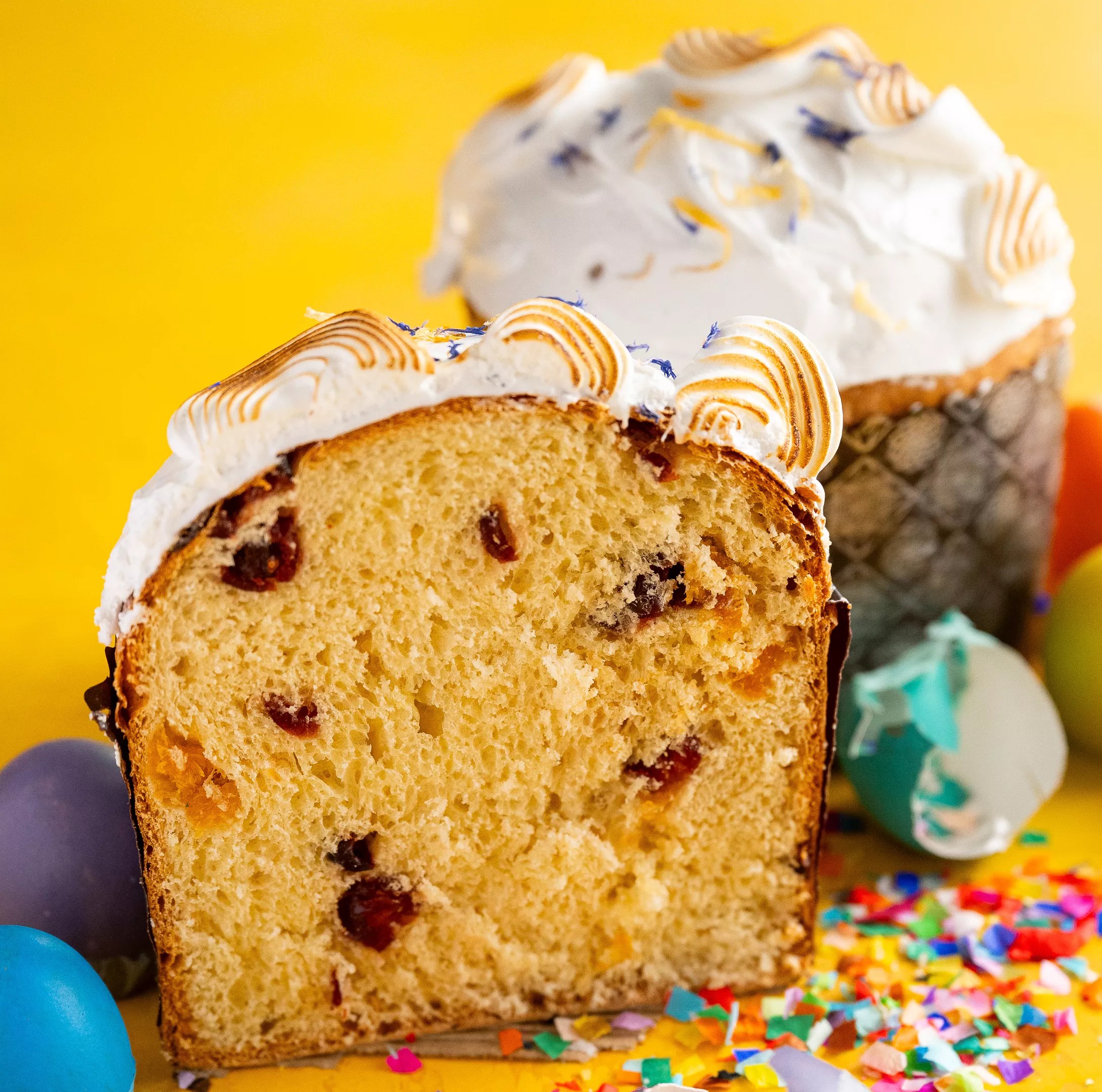 Paska falls somewhere between pillowy brioche and cake-like panettone. When sliced open, the bread has the blonde hue of a yellow cake. It usually has dried fruit mixed into the dough and is decorated with icing on top.