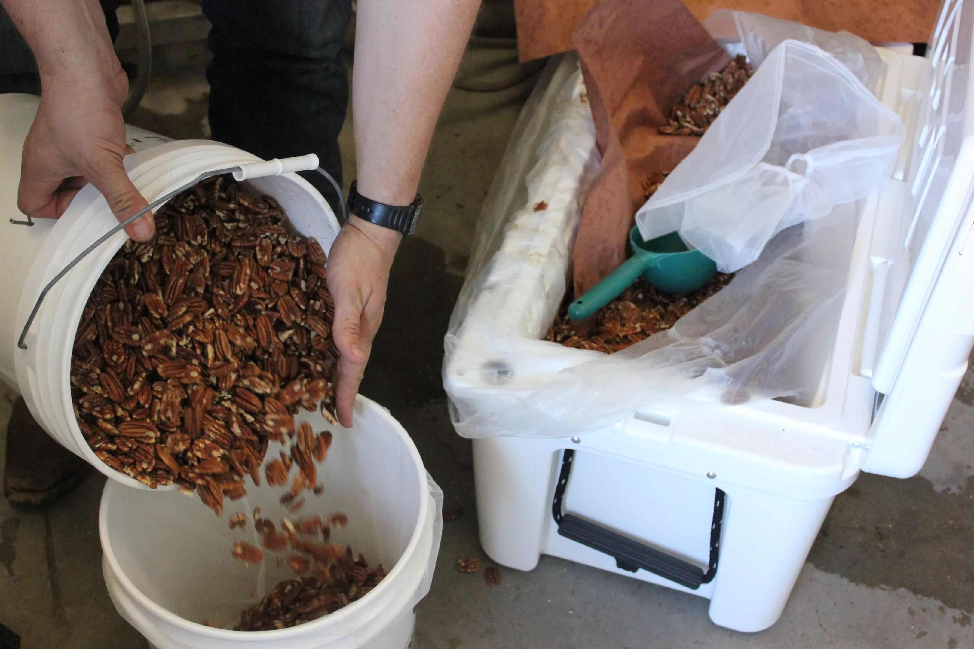 Frosty beers? Nope. He reveals the goods: 65 pounds of smoked pecans.